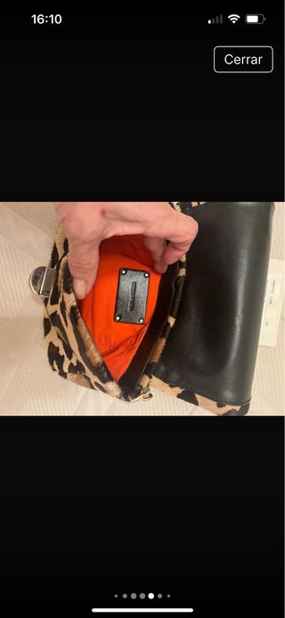 Bolso de Bimba y Lola, modelo del 2016, con un llamativo estampado de leopardo. - Cierre metálico con detalle naranja. - Correa combinada de piel y cadena. - Material exterior: piel de pelo
