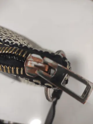 Pequeño monedero con un diseño de tejido trenzado - Cierre de cremallera. - Detalle de placa metálica dorada. - Combinación de hilos en negro, blanco, amarillo y azul. - Otra etiqueta interior de piel. - Está en muy buen estado, alguna pequeña marca en los dorados. - Original