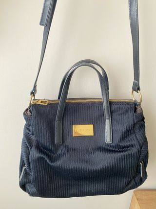 Bolso de mano en color azul marino. - Asas de piel negra. - Detalle de placa dorada con el logo de la marca.
