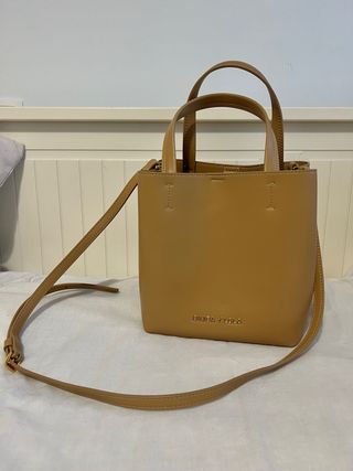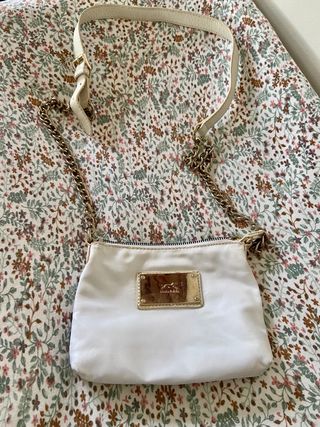 Bolso de piel de la marca Bimba y Lola en color beige. - Modelo chihuahua de la marca. - Asa corta y correa ajustable. - Tamaño aprox. 18x20x14cm (Nota: las piezas metálicas de la parte inferior están un poco rayadas)