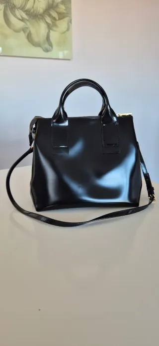 Elegante bolso de Bimba y Lola en piel charol. Lo he usado en muy pocas ocasiones. - Acabado brillante. - Cierre de cremallera. - Asa de mano y correa. - Logo dorado en el frontal.