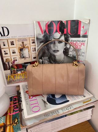 Bolso de piel en color camel. Tamaño pequeño. Asa de piel y cadena. Tiene un pequeño rasguño por la parte trasera y otra pequeña marca en una letra, ambos defectos poco significativos. En cualquier caso se pueden ver y valorar en las fotografías. SOLO REALIZÓ ENVÍOS