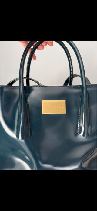 Elegante bolso de charol con un acabado brillante. Su diseño moderno lo hace perfecto para cualquier ocasión. - Material: Charol - Color: Verde azulado - Placa dorada con logo