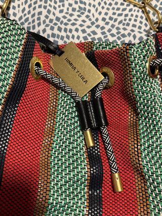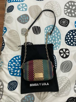 Bolso de mano Bimba y Lola con un diseño tejido y vibrante. - Diseño de rayas verticales en varios colores. - Placa dorada con el logo de la marca en la parte frontal. - Asa de cadena y correa de hombro. - Incluye bolsa guardapolvo negra con el logo de Bimba y Lola. Tiene marcas de uso en la placa dorada de Bimba y Lola.