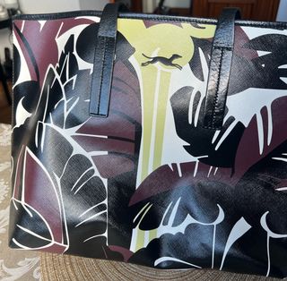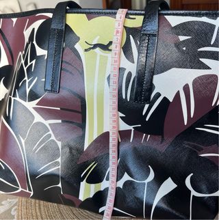 Bolso de mano Bimba y Lola con un llamativo estampado. - Diseño con hojas y rayas. - Dos asas negras. - Detalle de un galgo corriendo.