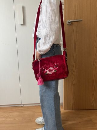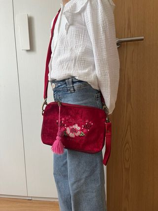 Preciosos bolsos infantiles de Busquets, ideales para el cole o actividades extraescolares. Se venden juntos. Son dos bolsos de tela roja con estampado floral y detalles decorativos. - El bolso más grande es tipo bandolera. - El más pequeño es un bolso de hombro. - Ambos están en buen estado.