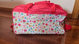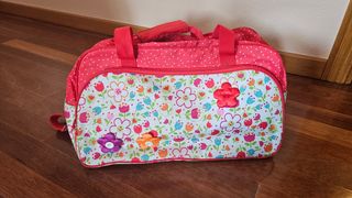 Práctica bolsa de viaje infantil con un alegre diseño floral. - Estampado de flores y topos en colores vivos. - Asas de mano y correa ajustable para hombro. - Ideal para escapadas de fin de semana.