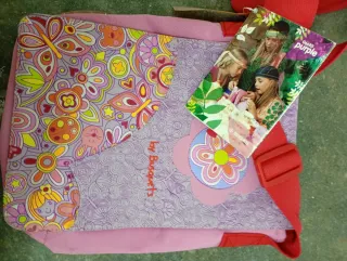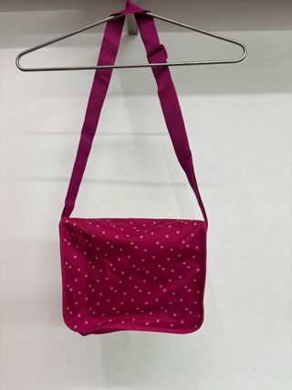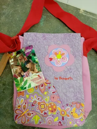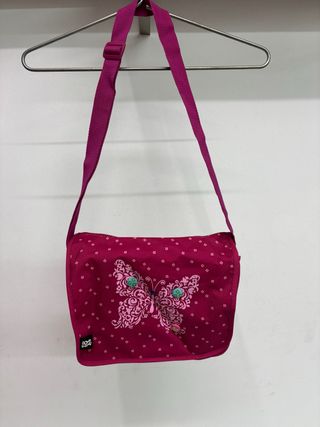 Busquets bandolera infantil, ideal para llevar carpetas o material escolar. Es de color rosa y verde, con un bonito estampado de mariposa. - Asa bandolera regulable. - Cremallera. - Perfecto estado.