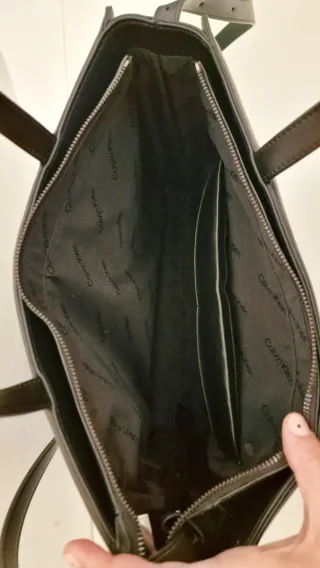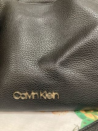 Elegante bolso de mano y bandolera de Calvin Klein. - Piel con textura. - Asa de mano y correa ajustable. - Detalle metálico con el logo de la marca. Bolso negro de piel sintética de Calvin Klein. Tiene los piquitos de las puntas desgastadas y las asas cortas algo peladas como pongo en las fotos, quizás se pueda arreglar o modificar. Por lo demás esta perfecto. Va con su bolsa guardapolvo. Se puede llevar de bandolera, hombro o de mano