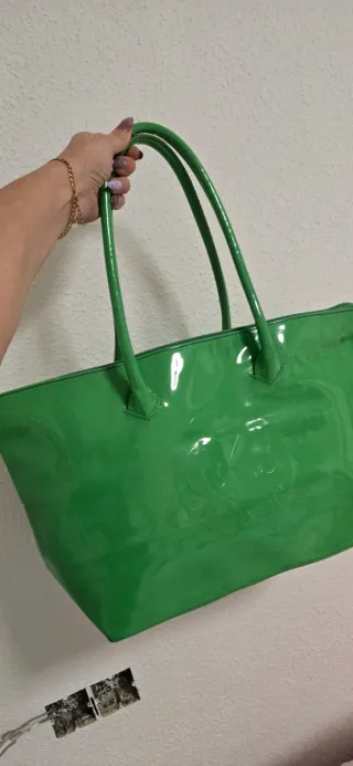 Bolso de mano estilo tote en llamativo color verde. Su acabado brillante le da un toque moderno y elegante. - Diseño tipo tote. - Acabado charol brillante. - Asas cómodas para llevar al hombro o en la mano.