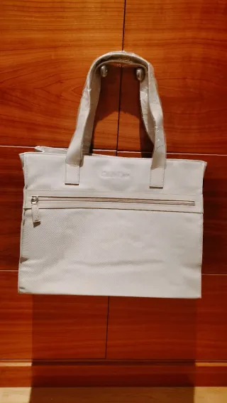 Bolso estilo tote de la marca Calvin Klein en color beige. Presenta un diseño elegante y funcional. - Compartimento principal con cierre de corchete de presión. - Bolsillo exterior con cremallera. - Asas cómodas para llevar al hombro.