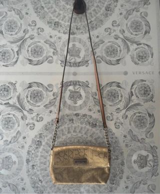 Elegante bolsa de mano con el distintivo estampado de la marca. - Correa de mano con detalle metálico. - Cierre de cremallera. - Diseño compacto y práctico.