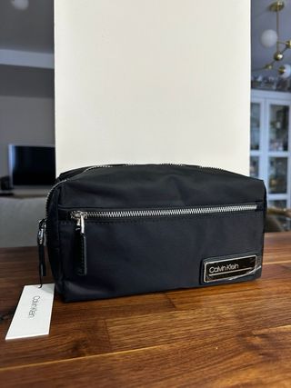 Neceser de la marca Calvin Klein en color negro, completamente nuevo a estrenar. Con etiqueta, costo 78€. - Diseño moderno y elegante. - Compartimento principal espacioso. - Asa lateral para facilitar el transporte.