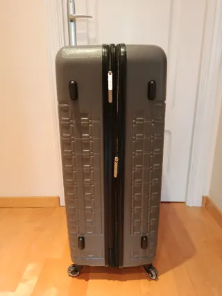 Maleta de tamaño grande de la marca Calvin Klein, en color gris. Ha sido utilizada una sola vez. - Diseño texturizado. - Ruedas para facilitar el transporte.