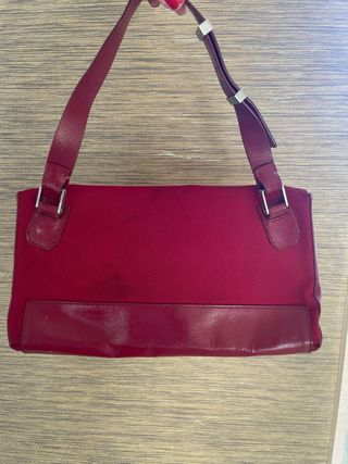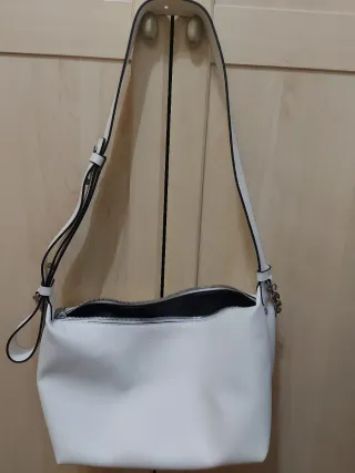 Bolso de mano con diseño moderno y elegante. - Asa corta para llevar en la mano. - Correa larga ajustable para colgar al hombro. - Detalle de logo de la marca. - Diseño con efecto madera en la parte frontal. Uno de los asos tiene señales desgaste,en foto no puede ver bien. El aso largo no usado, aparte de esto muy bien estado.