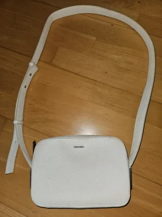 Bolso pequeño de Calvin Klein en color blanco. Un accesorio versátil y moderno. - Correa negra ajustable. - Cierre de cremallera. - Logo de la marca grabado en la parte frontal.