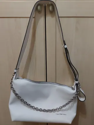 Bolso de hombro Calvin Klein blanco, con cadena metálica y asa ajustable, 100% poliuretano, sin bolsillos interiores. Medidas aprox: 26cm largo (parte inferior) y 33cm largo (parte superior) x 13cm ancho x 18cm alto (sin asa).