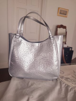 Bolso de mano y hombro Calvin Klein en color plata. Presenta un diseño texturizado con el logo de la marca grabado. - Asa doble. - Cierre superior.