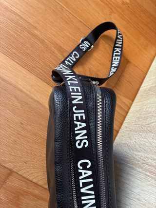 Bolso de piel negro de Calvin Klein con correa de tela. - Correa con logo Calvin Klein Jeans. - Cierre de 2 cremalleras, tiene 2 compartimentos. - Diseño moderno y versátil.