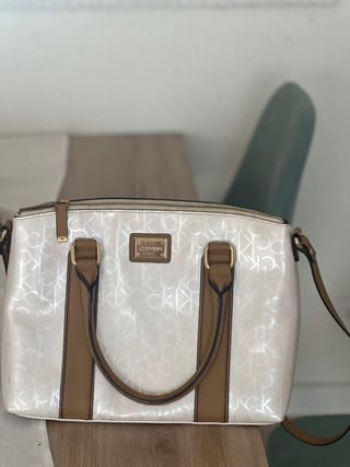Precioso bolso de mano Calvin Klein, en tonos beige y marrón. Es un bolso elegante y práctico, ideal para el día a día. - Asa de mano. - Cierre con hebillas. - Diseño con el logo de Calvin Klein.