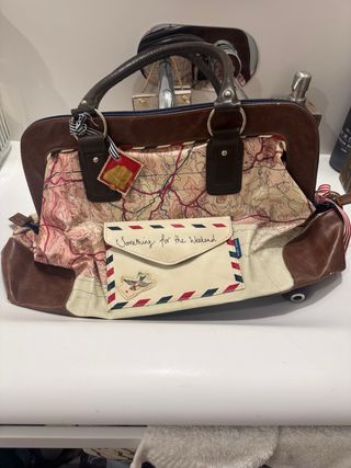 Bolso con un diseño original de mapa, ideal para viajes o para el día a día. - Asa de mano. - Cierre de cremallera. - Bolsillo frontal con solapa. - Detalle de etiqueta. - Ribetes decorativos.