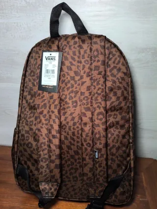 Mochila Vans Old Skool con un llamativo estampado animal print. Nueva con etiquetas. Bolsillo lateral para botella de agua. Varios compartimentos y apartado acolchado para el portátil o tablet. Capacidad de 22L. Dimensiones 41 alto x 30,4 ancho x 12 fondo. Tamaño normal para colegio o instituto.