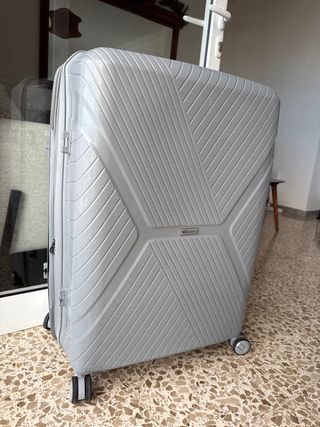 Maleta grande de la marca Valisa, completamente nueva. - Color plateado. - Diseño moderno con textura. - Ruedas para facilitar el transporte. Medidas: alto 76 cm( con ruedas). Ancho: 46. Fondo: 30.