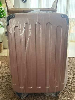 Maleta grande en color oro rosa, ideal para tus viajes. Cuenta con un diseño moderno y elegante. Nueva 63x38 con neceser a juego y con plásticos a estrenar - Material resistente. - Ruedas para fácil transporte. - Cerradura de combinación.