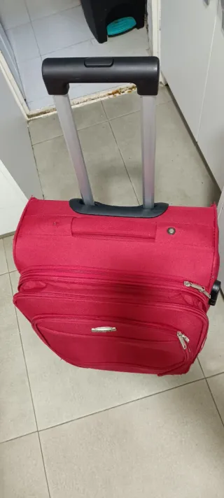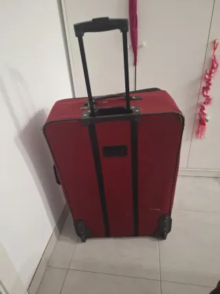 Maleta grande tipo trolley, roja. Marca Gladiator. Es un juego de dos. Esta es la grande y no la hemos usado. - Asa extensible para facilitar el transporte. Se fija a 2 alturas. Cuando está recogida, no sobresale de la maleta. - Asa lateral y superior para levantarla. - Cierre con cremallera. - Con 4 ruedas, para facilitar el transporte. - Bolsillo en el interior, con cierre de cremallera. Medidas en cm: 44 ancho x 68 alto (73 contando las ruedas) x 24 fondo (la tapa es semirrígida, si la llenas puede que sea 1-2 cm más)