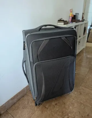 Maleta de viaje grande con asa retráctil y 4 ruedas para facilitar el transporte. Múltiples compartimentos para organizar tus pertenencias. En correcto estado interior y exterior aunque tiene algun pequeño desperfecto propio del uso. Medidas aproximadas: 54 cm de ancho X 89 cm de lato (incluyendo las ruedas) X 34 cm de profundidad. (A los que puedes sumar 5 cm más). Entrego cerca de plaza universitat, en Barcelona.