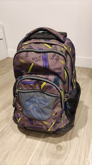 mochila escolar marca Totto con ruedas y opción colgar en la espalda. Está usada pero muy cuidada. En perfecto estado. sólo tiene un defecto en un lateral que se ve en la última foto. modelo skate.