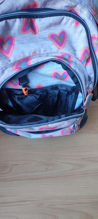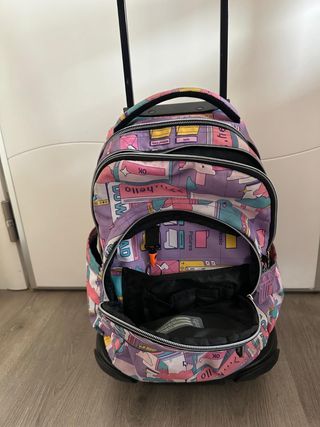Mochila infantil con ruedas, ideal para el cole. Está en perfecto estado y tiene un diseño colorido y alegre. - Tres compartimentos con cremallera. - Bolsillo frontal. - Asa de mano y ruedas para facilitar el transporte. - Diseño estampado con tonos rosas y multicolores. cemalleras nuevas , ni un raguño , el asa funciona en perfecto estado.