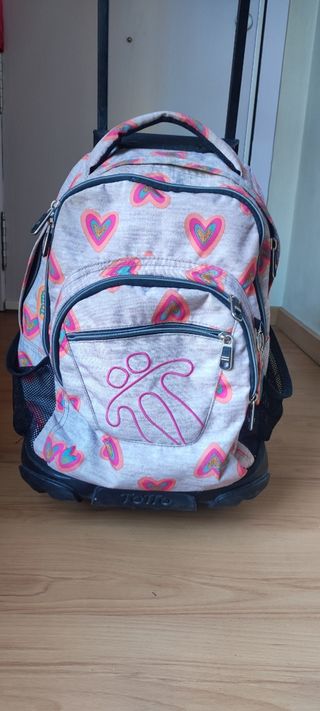 Mochila totto con ruedas, en buen estado. Los bolsillos laterales están un poco dados de sí, pero caben bien las botellas de agua