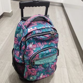 Mochila escolar Totto con ruedas, ideal para transportar libros y material escolar cómodamente. Está en buen estado, aunque presenta algunas señales de uso. - Mochila de gran capacidad. - Compartimento principal amplio. - Bolsillos adicionales. - Ruedas integradas para facilitar el transporte. - Diseño resistente Precio no negociable