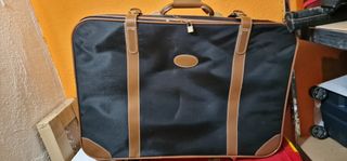 Conjunto de dos bolsas de viaje. - Una bolsa de cuero marrón. Medidas: ancho unos 50, alto 33 de fondo el principal 15 cm pero tiene 3 compartimentos grandes con cremallera y otro más pequeño delantero. - Una bolsa de tela beige con detalles en marrón. Marca el corte inglés. Medidas: ancho 65 aunque da más juego, alto unos 30 y de fondo unos 32. Como se aprecia en las fotos faltan pivotes en la parte de apoyo pero las ruedas funcionan correctamente. La parte de dentro cuarteada pero se puede quitar y poner otra cosa de base