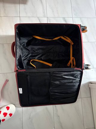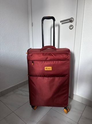 Maleta de viaje en color rojo de la marca Decent. Es espaciosa y práctica para tus viajes. - Diseño funcional. - Material resistente. Por fuera está algo desgastada ya, pero por dentro está como nueva. Abajo donde las ruedas la tela está algo pelada. El mango extensible,que va con el botón, se queda trabado dentro y cuesta sacarlo.