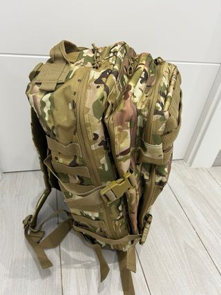 Mochila de estilo táctico y militar con un diseño de camuflaje. - Patrón de camuflaje en tonos verde oliva y negro. - Múltiples compartimentos y bolsillos. - Cintas de sujeción MOLLE.
