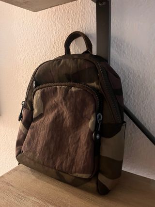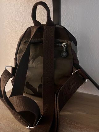 Mochila con estampado de camuflaje en tonos caqui y marrón. Como nueva - Etiqueta de la marca en la parte frontal.