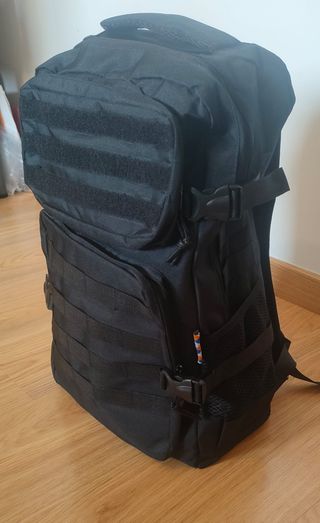 De la base francesa 188 de Yibuti. Mochila de estilo militar con un diseño de camuflaje digital. Cuenta con múltiples compartimentos y un panel frontal para personalización. - Diseño de camuflaje digital. - Panel frontal con sistema MOLLE. - Asas y correas acolchadas. Usada solo una vez