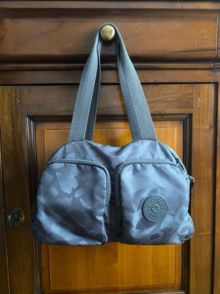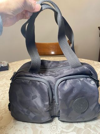 Precioso bolso Kipling en tonos grises .Es un bolso mediano , ideal para llevar lo esencial. - Asa de mano. - Cremalleras funcionales. - Diseño estampado de camuflaje. -Bolso Kipling color gris -tipo paquetero , medida 33x20x12 aprox -CASI NUEVO , muy poco llevado -dos bolsillos frontales uno con el anagrama y otro al dorso del bolso . -ideal para colgar al hombro o llevar en mano . -Incluye llavero del monito de Kipling -El tejido lleva unas irisaciones , como unas zonas que le diferencian de los tejidos lisos