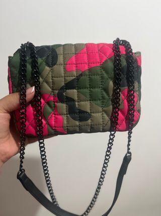 Bolso acolchado con estampado de camuflaje. - Diseño acolchado. - Cadena metálica negra. - Cierre de solapa.