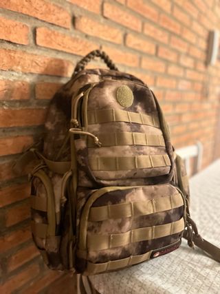 Mochila con diseño de camuflaje en tonos beige y marrón. - Compartimento principal espacioso. - Múltiples bolsillos exteriores. - Sistema MOLLE para accesorios. - Asa superior reforzada. - Correa de hombro ajustable