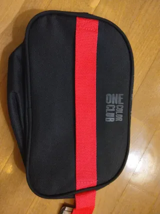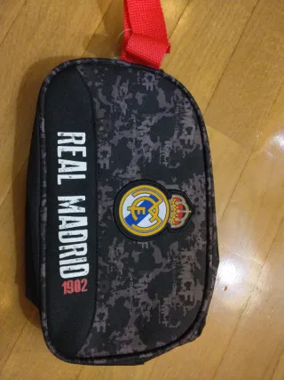 Neceser con el escudo del Real Madrid y el año 1902. - Diseño con estampado camuflaje. -Color negro. - Correa roja. - Cierre de cremallera. -Producto de Safra SA. -Excedente de una tienda, en perfectas condiciones.