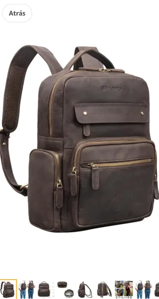 Mochila de cuero de estilo clásico, con un diseño atemporal y acabados de calidad. Muchos bolsillos y compartimentos. - Material: Cuero genuino. - Color: Marrón. - Cierre principal con cremallera. - Bolsillos exteriores. - Correa de ajuste frontal. Las cremalleras cierran y abren bien, pero algunos enganches (la pieza de la que se tira) se han desgastado/oxidado un poco, bastaría con cambiar esas piezas, pues las cremalleras funcionan bien.