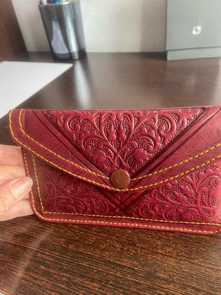 Elegante billetera de cuero con un diseño floral grabado. - Cierre de botón a presión. - Costuras decorativas en hilo amarillo. - Acabado en relieve.