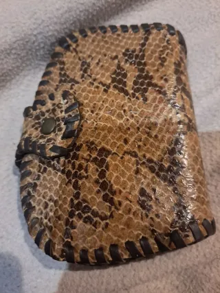 Cartera de cuero con un diseño único y detalles cosidos a mano. - Material: Cuero - Cierre con botón a presión - Diseño con textura de serpiente en la solapa - Adorno metálico en el cierre