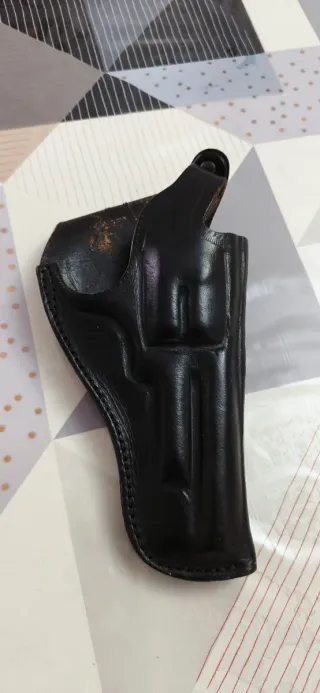 Funda de cuero para revólver. Diseñada para un ajuste seguro y cómodo. - Material: Cuero. - Color: Negro y marrón.