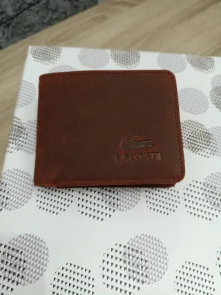 Elegante billetera de cuero en color marrón. - Diseño clásico y funcional. - Logo de Lacoste grabado.