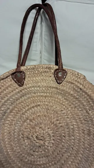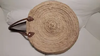 Bolso de mimbre redondo con asas largas de cuero. - Material: Mimbre - Asas: Cuero Capazo hecho a mano artesanalmente. Medidas aprox. 47/48 cms. De diámetro.