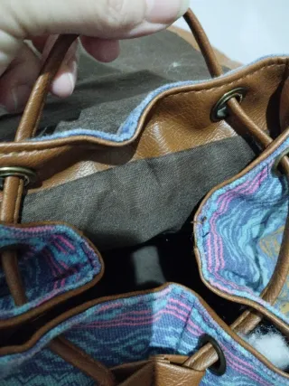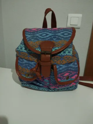 Mochila con un diseño étnico vibrante y detalles en cuero sintético. - Estampado geométrico en tonos azules, rosas y naranjas. - Cierre principal con solapa y hebilla. - Dos bolsillos frontales con solapa. - Asas ajustables.